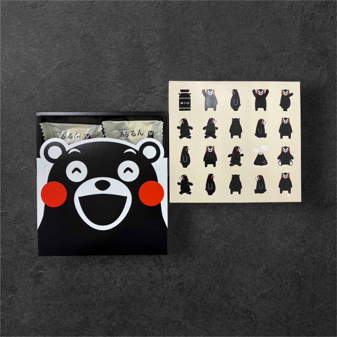 阿蘇みるく饅頭みるるんに、くまモンバージョンが出来ました!キュートなくまモンが、ひょこひょこひょこと顔を出してかわいさ倍増です。